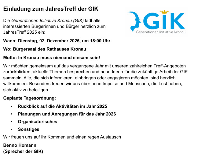 Herzlich willkommen auf der Homepage der „Generationen Initiative Kronau“ (GIK)